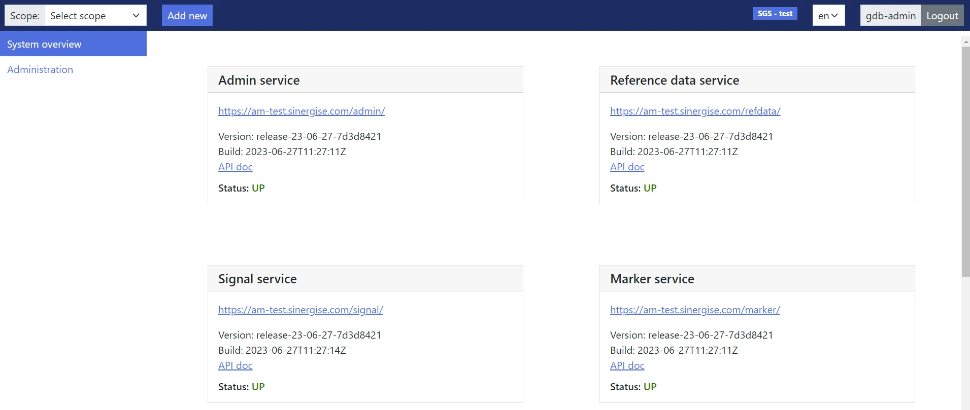 | System overview section | Shows the following details about the services that are part of Area Monitoring applications: service name, base URL, version information, build information, API documentation presented as a hyperlink and status information. |