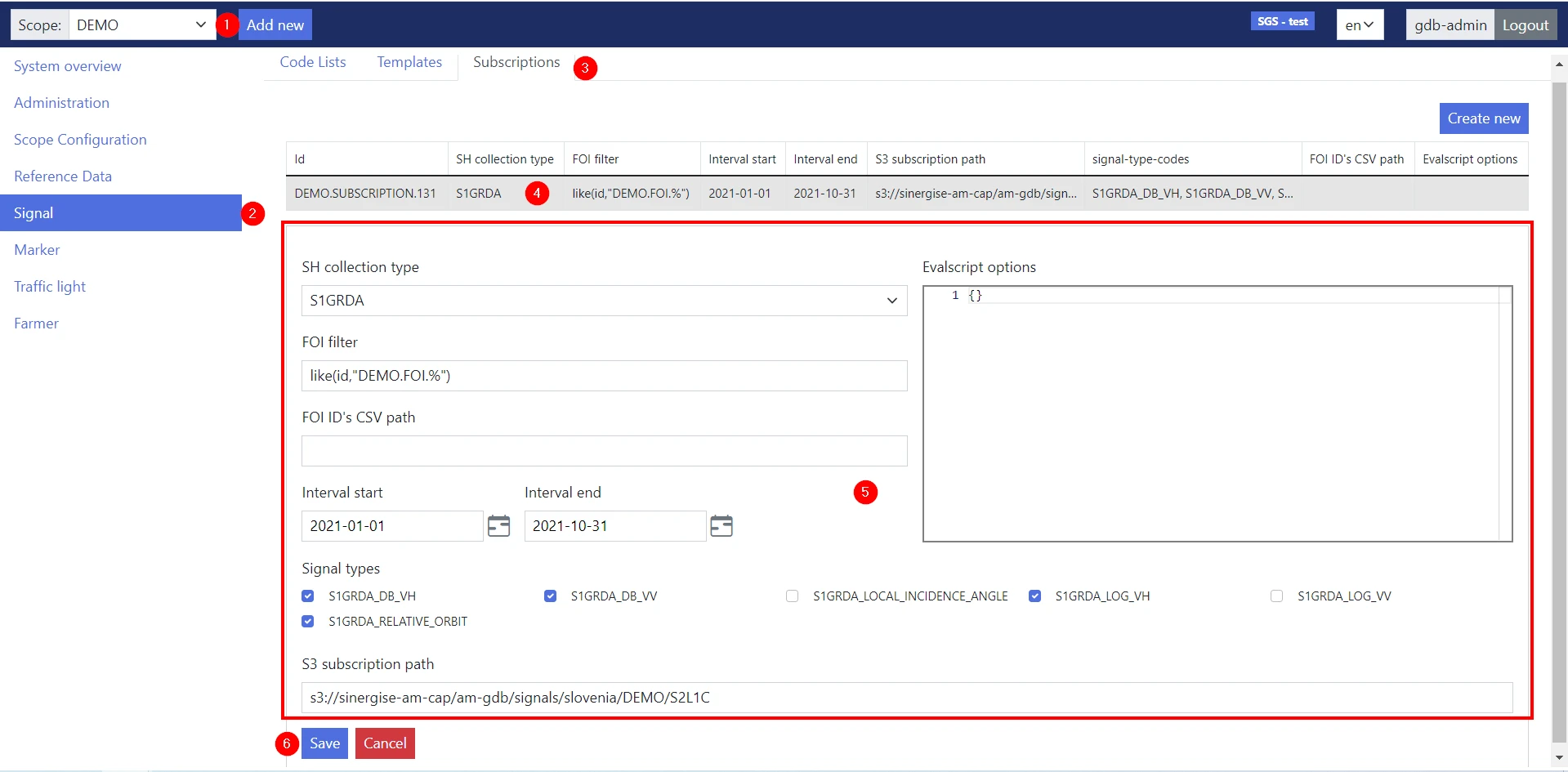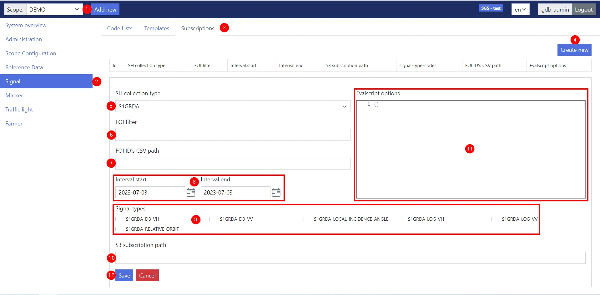 Interval startandInterval endkeep in mind that subscriptions are only incremental in time. That means that if any signals were already downloaded (DONE signal packages exist) thatInterval startshould not be changed andInterval endcan only be incremented in time. See Create a subscription for an explanation of the fields. - Click Save.