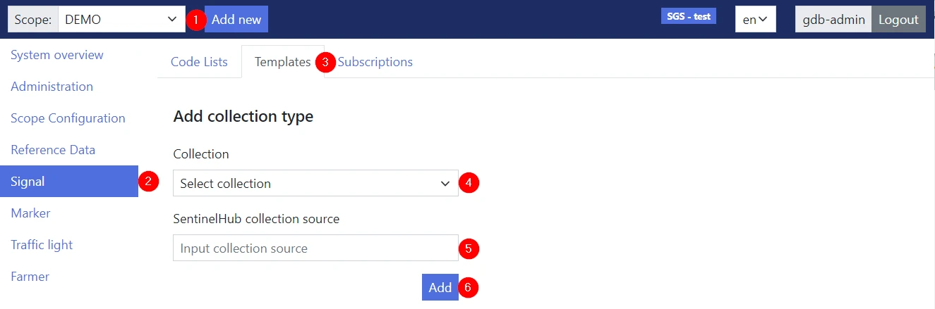 In the sections Signal and Marker you can use templates to populate in bulk the records of the Code lists with data from predifined Code list templates for each Sentinel Hub (SH) collection.