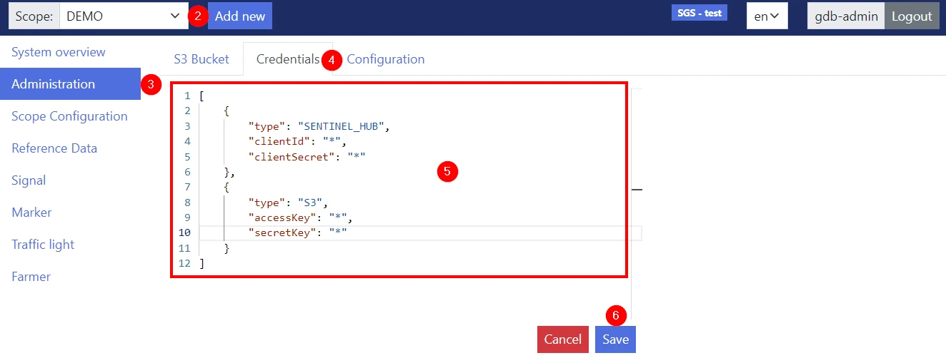- Enter the S3 bucket credentials, the Sentinel Hub Client ID and Client Secret in JSON format.
