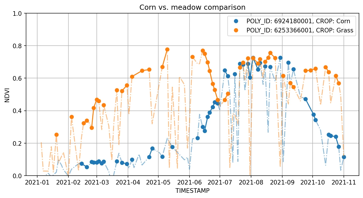 Each FOI has a declared crop. The crop defines the behavior of the time-series of signals throughout the year. As an example, below we show the NDVI time-series of two FOIs. The one in blue has an associated crop with ID 005 (corn), while the one in orange has an associated crop with ID 204 (grass).