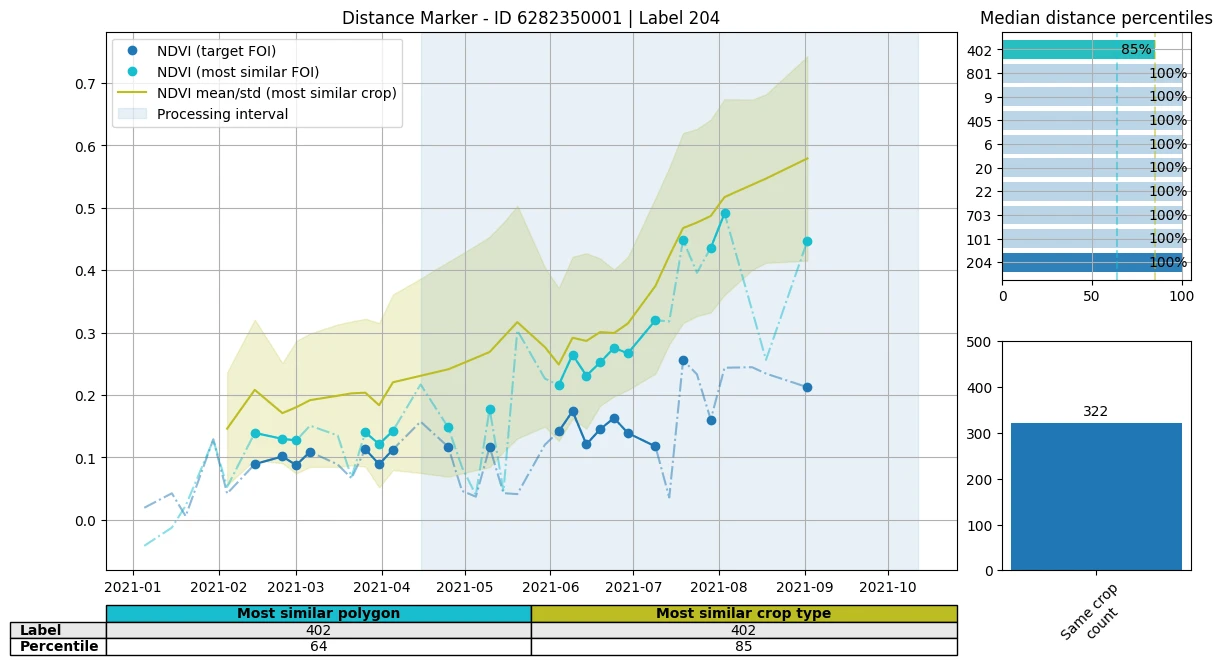 - the outliers from the distance marker. As an example we show a FOI that has been declared as a meadow (204), however the distance and similarity markers point to this claim to likely be incorrect.