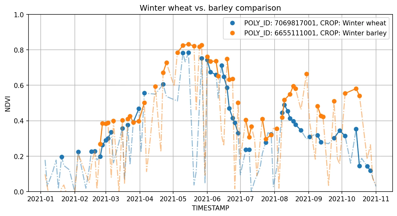 Clearly, both crops have vastly different behavior and should thus be easily recognizable. However, not all crops are as easily separable. Next we show two FOIs with declared winter wheat (blue) and winter barley (orange).