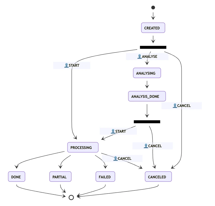If we want to obtain the signals from the satellite images over larger areas, for example, for the whole country, for several months, we need to do this efficiently. For this purpose, we are using the Sentinel Hub’s Batch Processing API, which splits the area of interest in managable smaller chunks, downloads various indices and raw bands for each available date, then creates a harmonized time-series feature by filtering out cloudy data and interpolating values to get uniform temporal periods. The outputs of a batch processing are stored to the object storage. On the image below, workflow overview of the Batch Processing commands, and the different statuses that can be triggered.