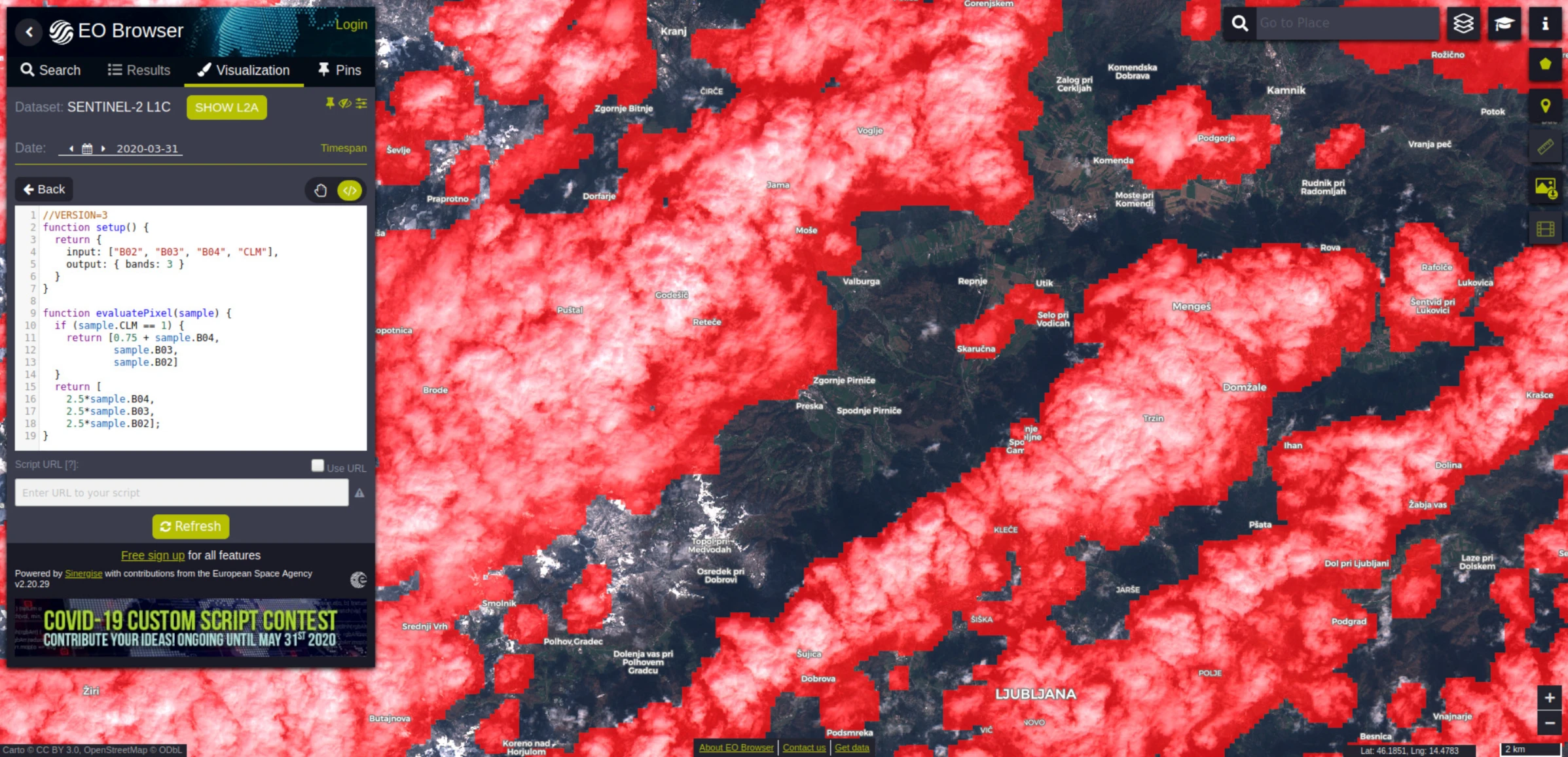 s2cloudless assigns each pixel a cloud probability based on the pixel’s ten Sentinel-2 band values. Cloud probabilities and masks are available through the Sentinel Hub services when requesting L1C or L2A data for the entire Sentinel-2 archive. Below, a screenshot from EO Browser with a simple custom script for masking out the clouds using the cloud mask information from the Sentinel Hub service.