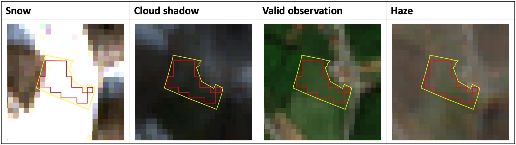 Once the cloudy observations have been filtered out, we are left with a mixture of valid observations and a set of undetected anomalous observations. The latter are mostly caused by cloud shadows, snow and haze. Below, see some examples of outliers.