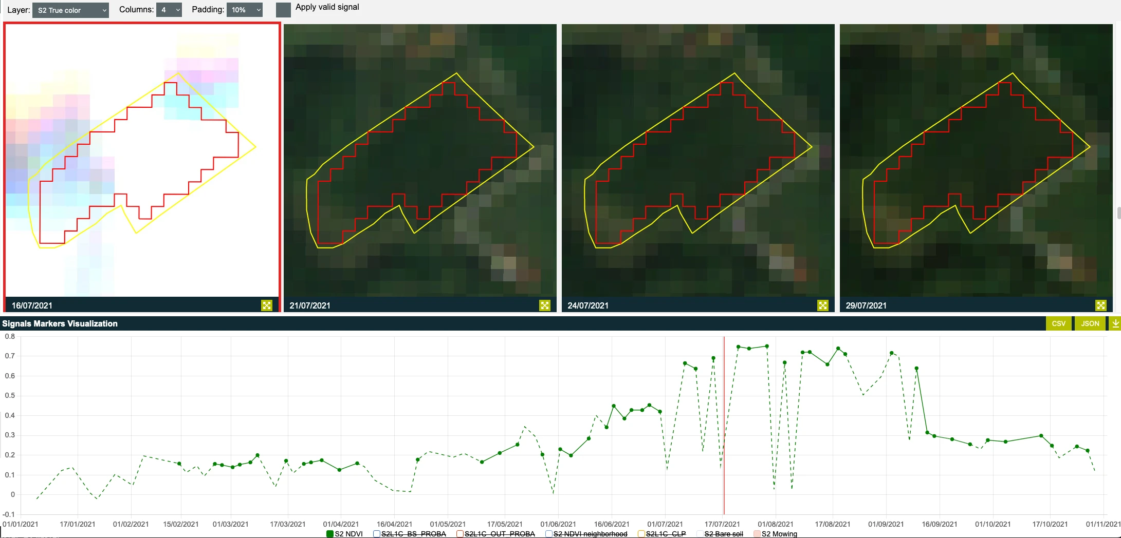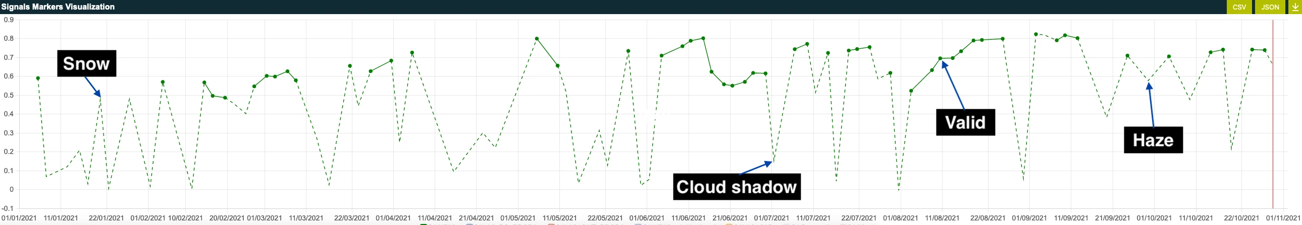 Time-series of mean Normalized Difference Vegetation Index (NDVI) for the same FOI as mentioned above is shown as a green dashed and solid line in the figure below. Sudden drops of NDVI are due to invalid observations, which were identified and filtered out with Sentinel Hub’s s2cloudless cloud masking algorithm and observation outlier detection algorithm. The red vertical line on the time-series plot corresponds to the first Sentinel 2 image on the left. The green dots indicate all remaining valid observations which are used for the calculation of the markers.