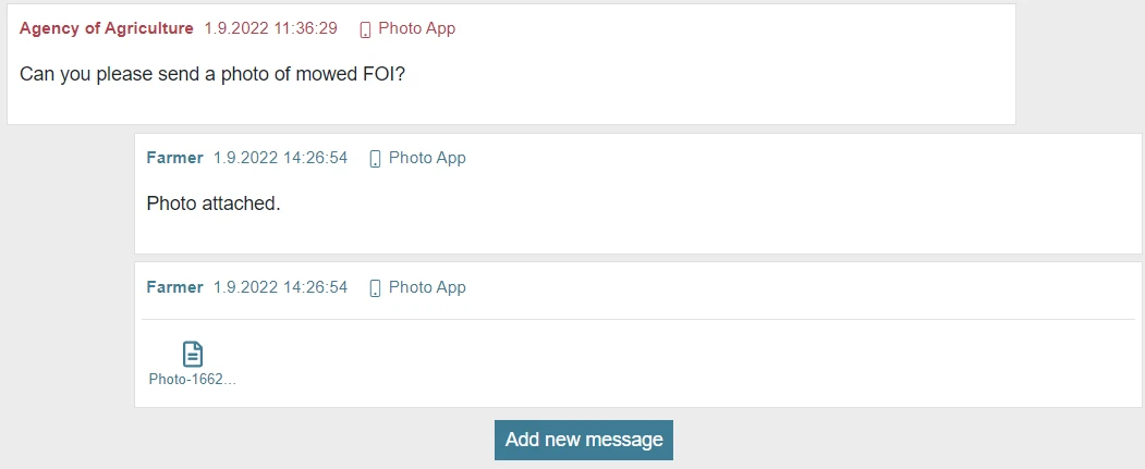 Communication React component displays a communication thread regarding selected agricultural parcel between the farmer/holding and the agency.