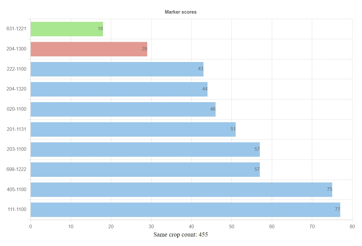 Marker Scores React component displays a histogram of provided classification marker type scores (for example, similarity, distance, crop group, land cover group) for selected FOI.
