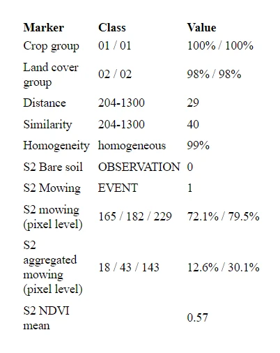 The Markers Summary React component is used to display a summary of markers (for example, crop group, land cover group, distance, similarity, homogeneity, bare soil, mowing, pixel mowing, mean NDVI) for selected Feature of Interest (FOI) and marker context, that can be filtered by Sentinel Hub (SH) collection type.