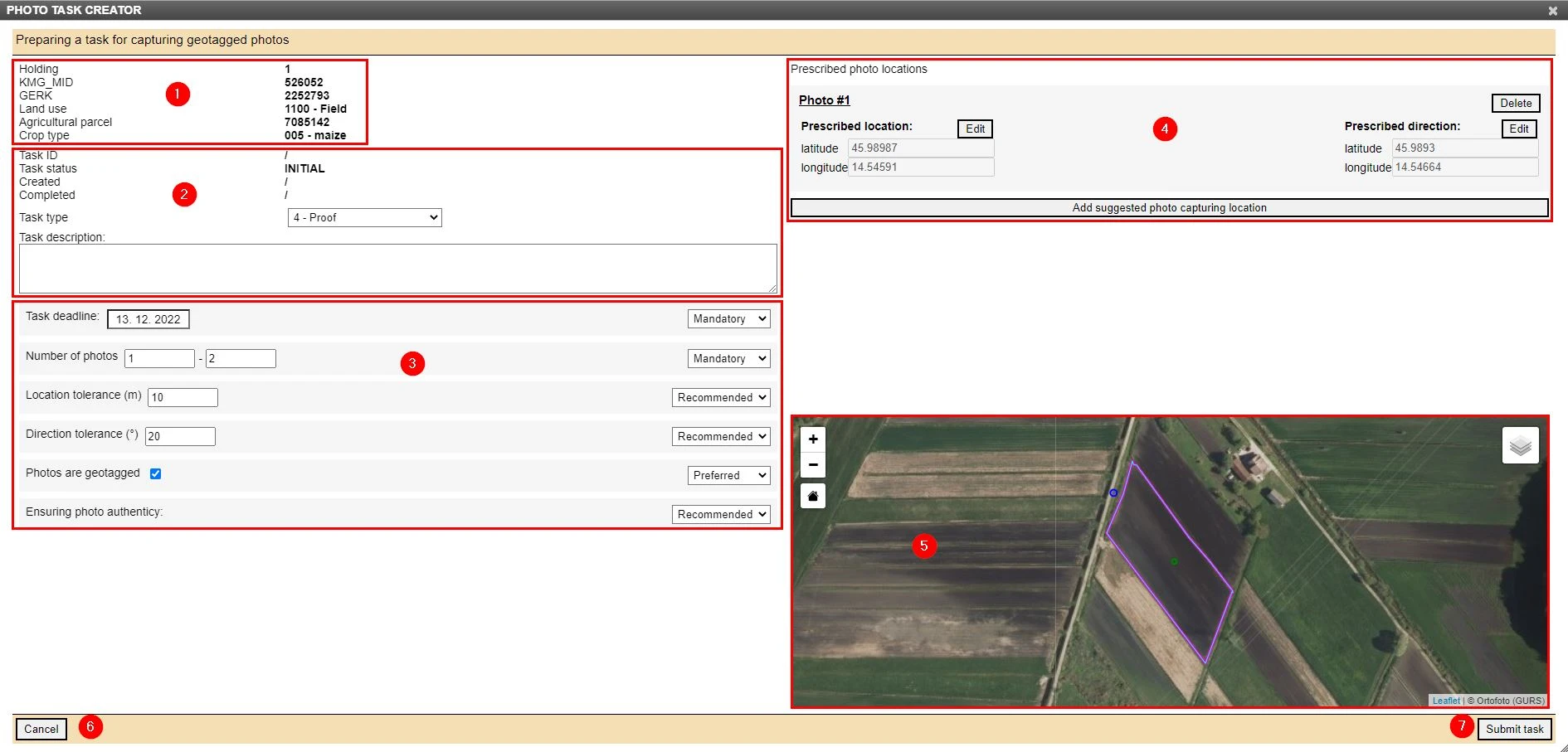 (1)Basic information of agricultural parcel for which photos are required(2)Basic information about the photo task:- User selects task type from drop-down list and writes task description in the text input area