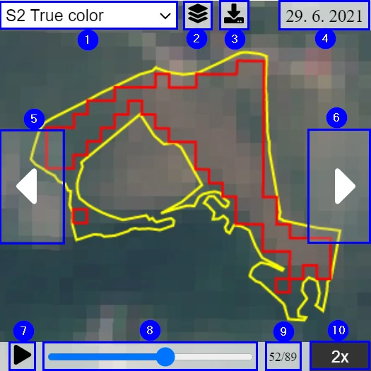 (1)drop-down list of layers to select a layer to be displayed in the timelapse component(2)check-box list of FOI geometry types (original, pixelated) to be displayed in timelapse component(3)button to generate and download timelapse GIF animation through all image chips(4)date of the currently displayed image chip in the timelapse component(5)/(6)button to manually navigate the timelapse component to the previous/next image chip(7)button to play/pause timelapse animation through all image chips(8)slider to manually navigate timelapse component through image chips(9)sequence number of current image chip and number of all image chips(10)button to control the speed of timelapse animation