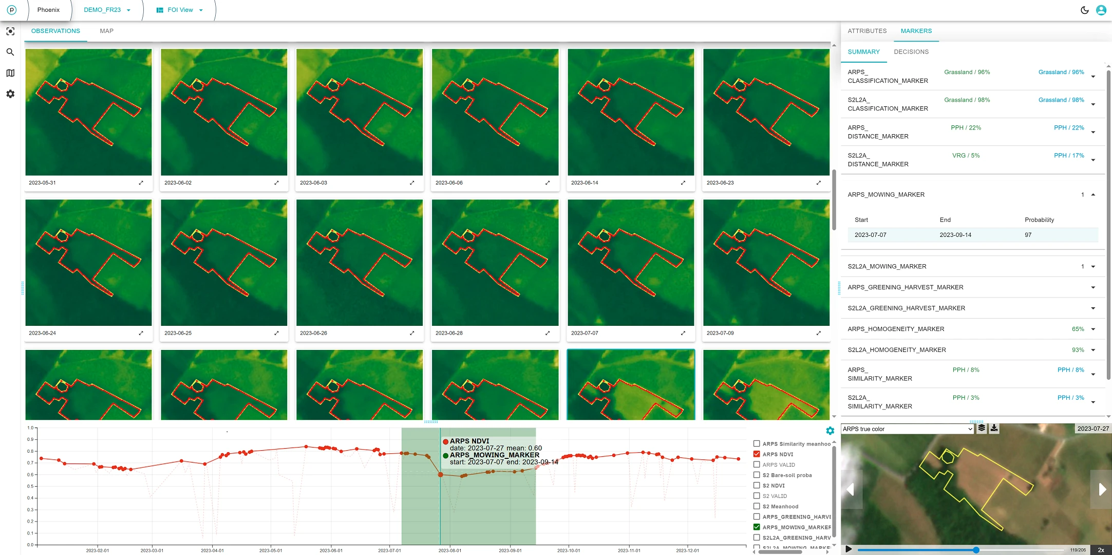 FOI = 92269889 is declared as permanent grassland. The analysis shown in the Area Monitoring App confirms this classification: