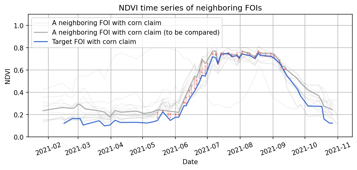 Figure below shows the comparison of NDVI time series of a FOI claimed to grow winter wheat and an average of 100 neighboring FOIs with the same claim. Numerator in the above equation, , is shown in the figure with red arrows and the denominator, , is shown with blue arrows. The figure nicely illustrates that the shorter the red arrows are, the more similar the FOI is to its neighboring FOIs with a given claimed crop.