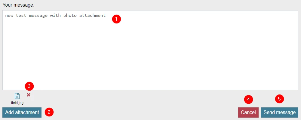 (1)text area input field for the user to write a message(2)message attachments can be added by clicking the button. User browses file to be uploaded from local drive.(3)already uploaded files can be removed from attachments by clicking the button(4)adding a new message can be canceled by clicking the button(5)new message is added by clicking the button