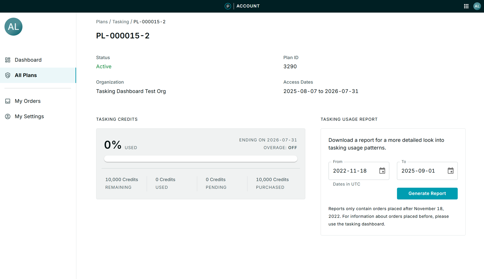 - From the Planet Account Page, you can view the quota bars for tasking quota usage, and run Quota Usage reports. Manage Your Account provides complete details.