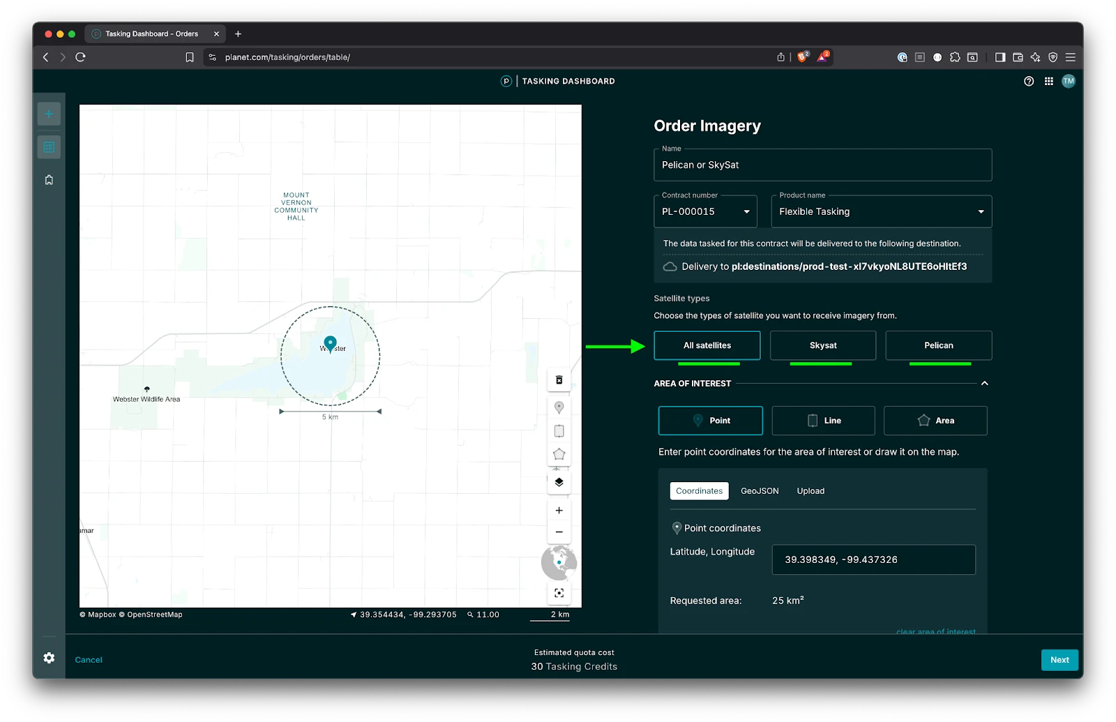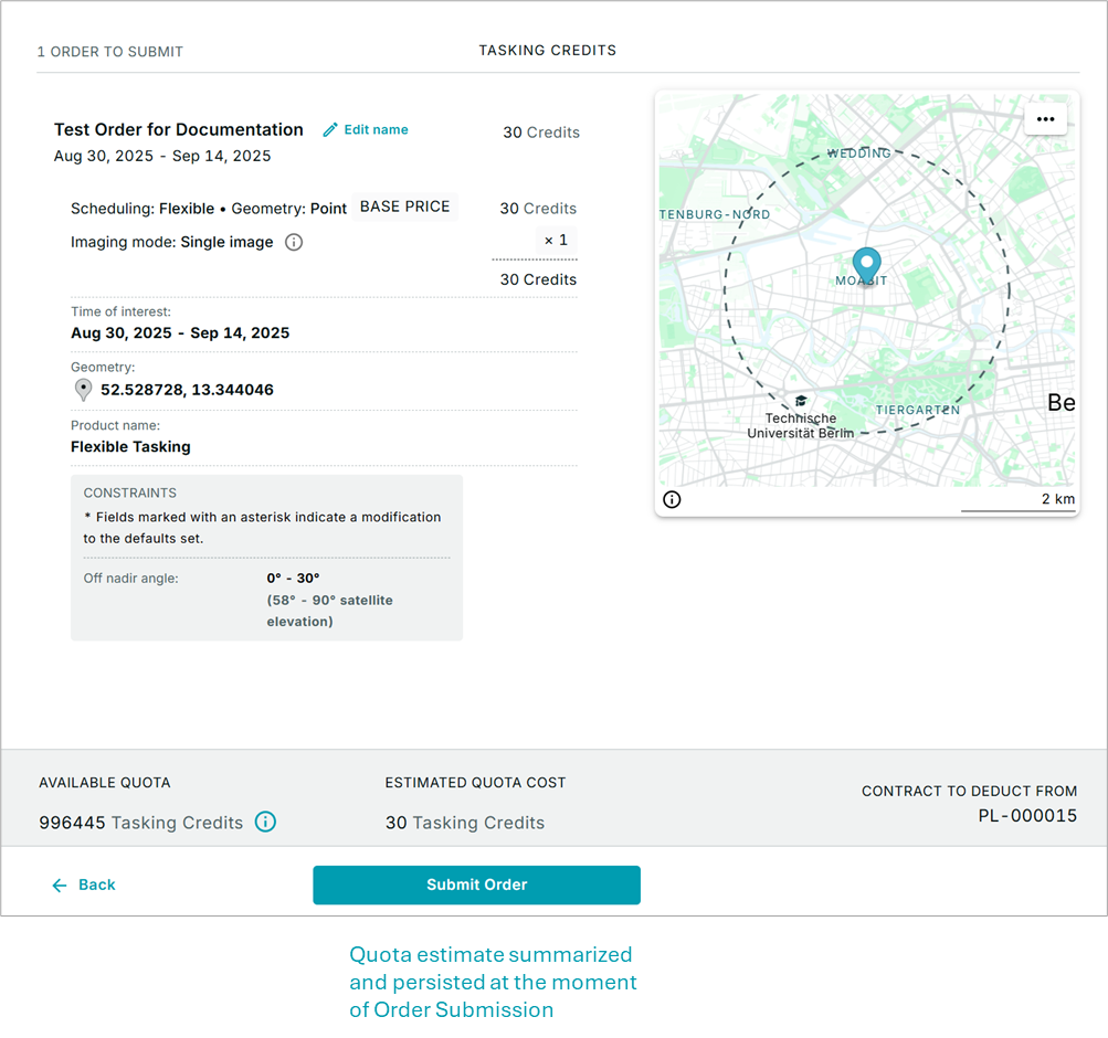 - As you enter a tasking order, a quota preview displays the estimated quota in sq km or tasking credits directly in the Tasking Dashboard Order Summary. Quota estimates are dynamically updated as you input and adjust requirements.