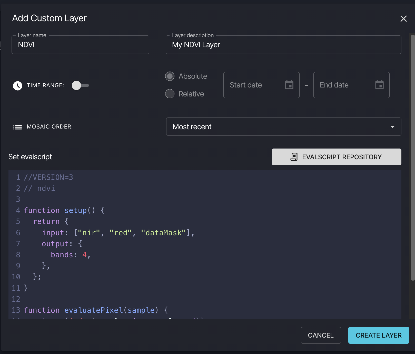 Evalscripts are JavaScript code blocks that define how to process and visualize satellite data. Every visualization layer uses an evalscript - pre-built layers come with evalscripts, while user-defined layers let you define your own.