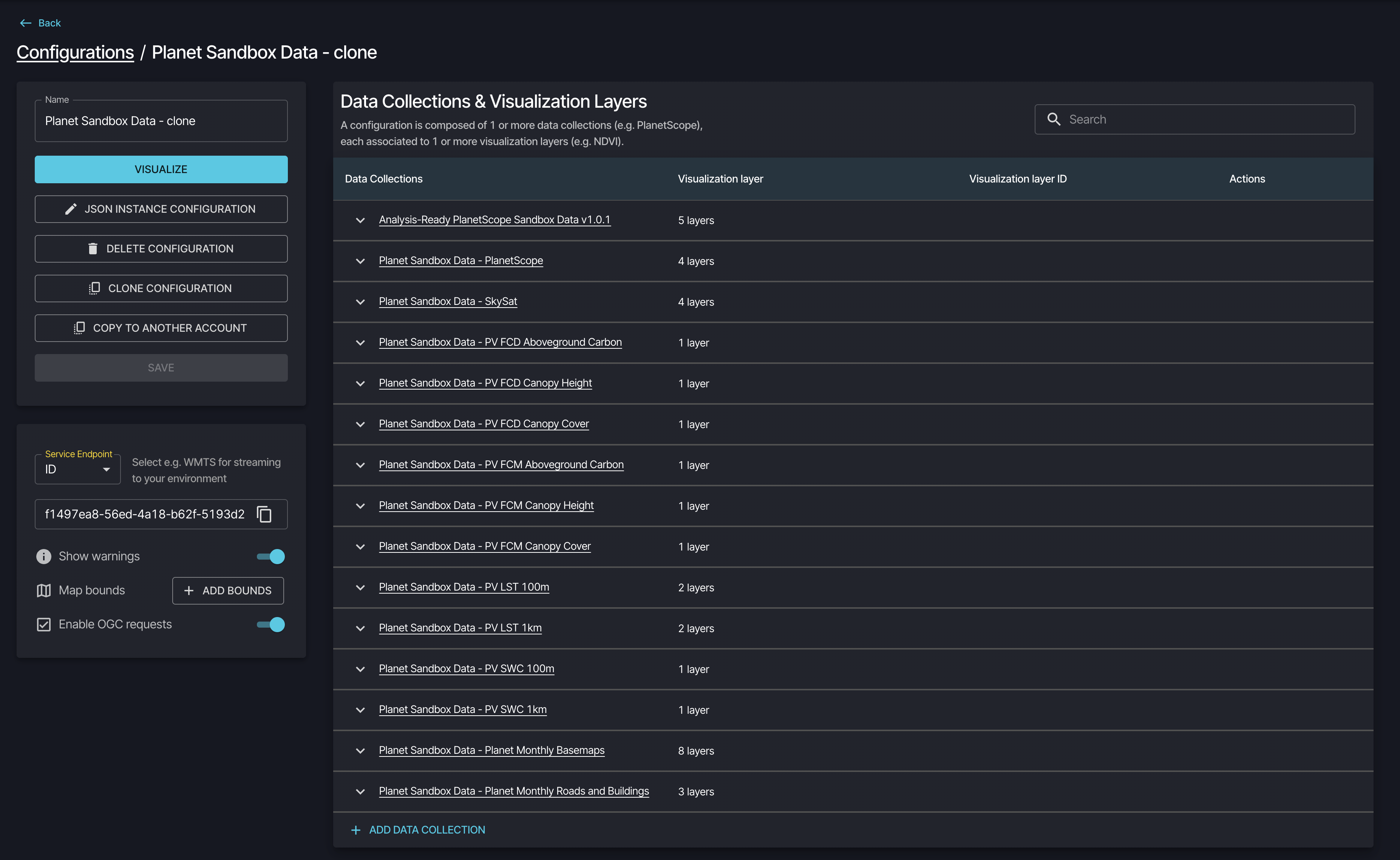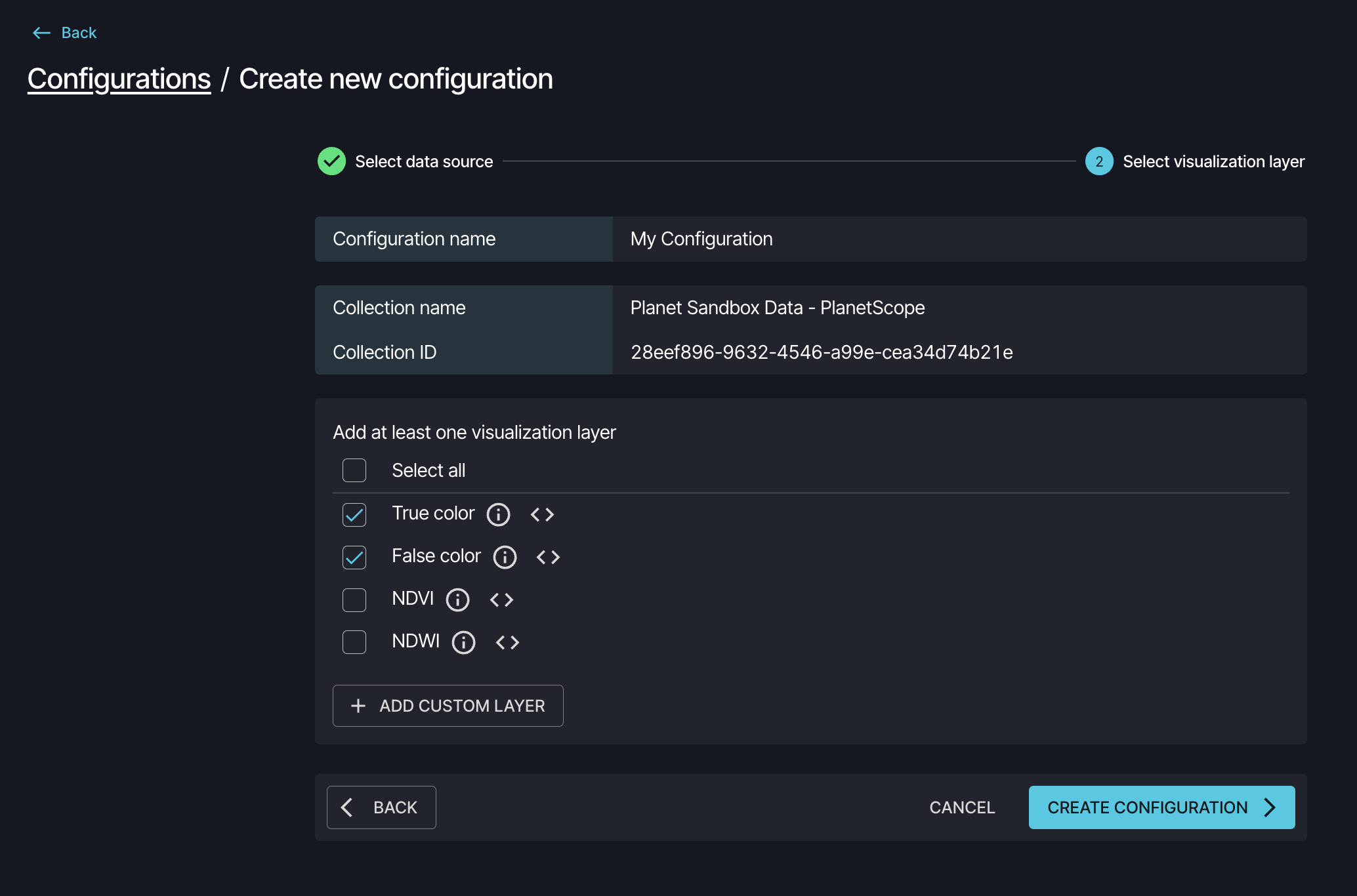 A configuration is a set of visualization layers that define how data from your data collections should be displayed in the Browser and OGC services, making it easy to analyze imagery and access it through OGC-compliant applications.